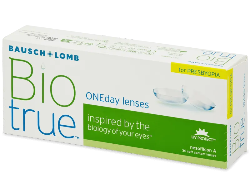 Biotrue ONEday for Presbyopia son las lentillas multifocales de Bausch and Lomb específicamente diseñadas para resolver problemas visuales causados por la presbicia. La presbicia, o la presbiopia senil es un defecto de la visión que emerge como una consecuencia natural del envejecimiento del cuerpo humano y comienza a ocurrir alrededor de los cuarenta años de vida. La presbicia se define deteriorando la capacidad de enfocar objetos cercanos.