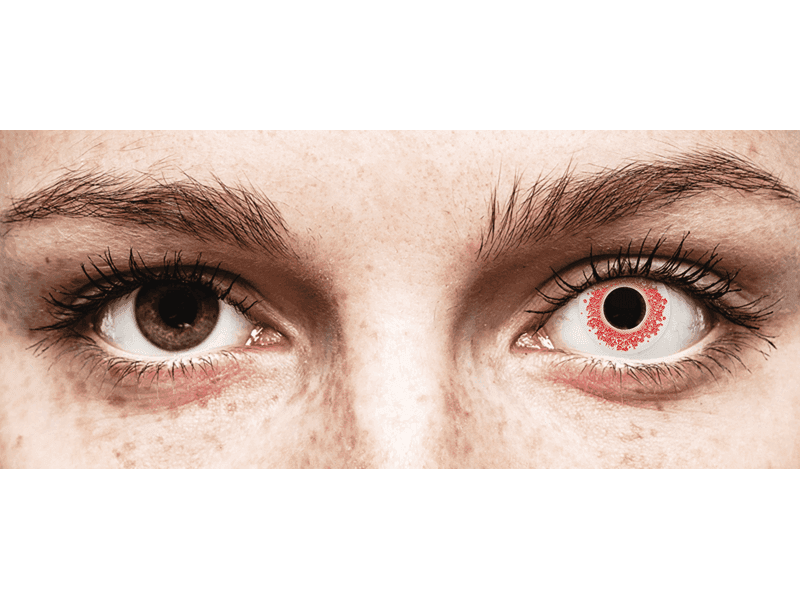 Estas lentillas blancas tienen pequeños lunares irregulares de color rojo a lo largo del perímetro. Si deseas disfrazarte con temática de una boda sangrienta, este es el diseño para ti. Sin embargo, también funciona perfectamente para zombies, personajes de terror, o el popular disfraz de La Calavera Catrina, también conocida como las calaveras de azúcar decoradas, parte de la festividad mexicana Día de los Muertos.